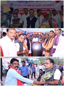 कवर्धा… उपमुख्यमंत्री विजय शर्मा द्वारा स्वीकृत ‘मुख्यमंत्री ग्रामीण गौरवपथ योजना’ के अंतर्गत ग्राम पंचायत रौचन में 41.65 लाख रुपये (एकतालीस लाख पैंसठ हजार रुपये) की लागत से निर्मित होने वाले गौरव पथ सड़क का भूमिपूजन कार्यक्रम जिला पंचायत अध्यक्ष ईश्वरी साहू , जिला पंचायत उपाध्यक्ष कैलाश चंद्रवंशी , जिला पंचायत सदस्य प्रतिनिधि लोकचन्द साहू , जिला बीजेपी उपाध्यक्ष नितेश अग्रवाल , बोडला जनपद उपाध्यक्ष नंद श्रीवास , मिलु राम साहू अध्यक्ष भाजपा भोरमदेव मंडल राजेश साहू सदस्य प्रतिनिधि जनपद पंचायत बोड़ला , भगत साहेब उपाध्यक्ष भाजपा भोरमदेव मंडल गुलाब साहू पूर्व अध्यक्ष भाजपा भोरमदेव मंडल सहित भारतीय जनता पार्टी के पदाधिकारीगण एवं ग्रामवासी की उपस्थिति में भूमिपूजन हुआ । ग्रामीणों में भारी खुशी दिखी ।