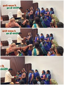 रक्षा सूत्र बाँधने पहुँचे बड़े दीदी का पैर छूकर प्रणाम करते हुए सभी का आभार प्रकट किया और सम्मान स्वरूप मिठाई खिलाया। स्वच्छता दीदी भी इस तरह की आयोजन में अध्यक्ष को अपने बीच पाकर खुश हुए। कार्यक्रम के दौरान कार्यालय का माहौल उत्साह और भाईचारे से भरा रहा।