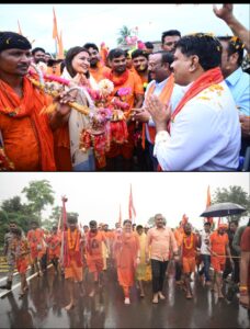 इस अवसर पर भावना बोहरा ने कांवड़ यात्रा में सहभागी बनने और पुष्पवर्षा कर भव्य स्वागत करने क लिए उप मुख्यमंत्री श्री विजय शर्मा जी, समस्त भाजपा पदाधिकारी कार्यकर्ता, युवा एवं महिला मोर्चा के सदस्यों, विभिन्न सामाजिक व हिन्दू संगठनों तथा जनता के प्रति आभार व्यक्त किया। भावना बोहरा ने कहा कि सनातन संस्कृति में कांवड़ यात्रा का विशेष महत्व है। यह आस्था का वो प्रवाह है, जो सर्व समाज और देश को भक्ति की एकता में जोड़ता है। इसी भक्ति भावना से शक्ति प्राप्त करके हम छत्तीसगढ़ की समृद्धि और प्रदेशवासियों की खुशहाली की कामना लेकर माँ नर्मदा, अमरकंटक से भोरमदेव मंदिर की कांवड़ यात्रा पर निरंतर गतिमान है। विगत छः दिनों में अमरकंटक से निकली हमारी यात्रा में कई उतार-चढ़ाव आए, घने जंगलों, उफनती नदियों, पहाड़ों एवं तेज बारिशों का सामना करते हुए हमारी यात्रा भगवान भोलेनाथ एवं माँ नर्मदा के आशीर्वाद से निरंतर आगे बढ़ रही है और भोलेनाथ जी कृपा से कल हम अपने अंतिम पड़ाव की ओर बोड़ला से भोरमदेव मंदिर की ओर प्रस्थान करेंगे। मैं इस अवसर पर कबीरधाम जिले के समस्त शिवभक्तों को बी निवेदन करती हूँ कि वे भोरमदेव मंदिर में रविवार को जरुर पधारें और भगवान भोलेनाथ जी का जलाभिषेक करके इस पुण्य यात्रा के सहभागी बनें।