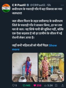 केंद्रीय मंत्री सी आर पाटिल ने सोशल मीडिया हैंडल ‘एक्स’ पर ट्वीट कर जल जीवन मिशन के क्रियान्वयन की सराहना की